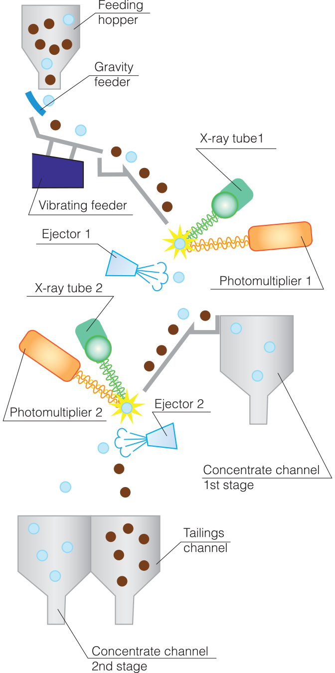 The principle of operation of the sorter is based on the use of the property of diamonds to luminesce under the exposure to X-rays and the difference of these properties in diamonds and associated luminescent minerals.