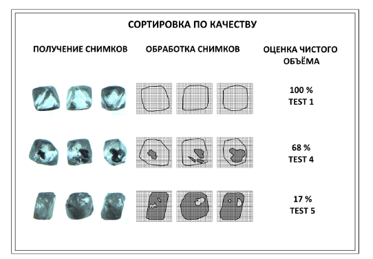 The classifier program, based on the images from 7 cameras, creates a model of the diamond crystal, determines its quality and gives a quality class number to the executive unit.