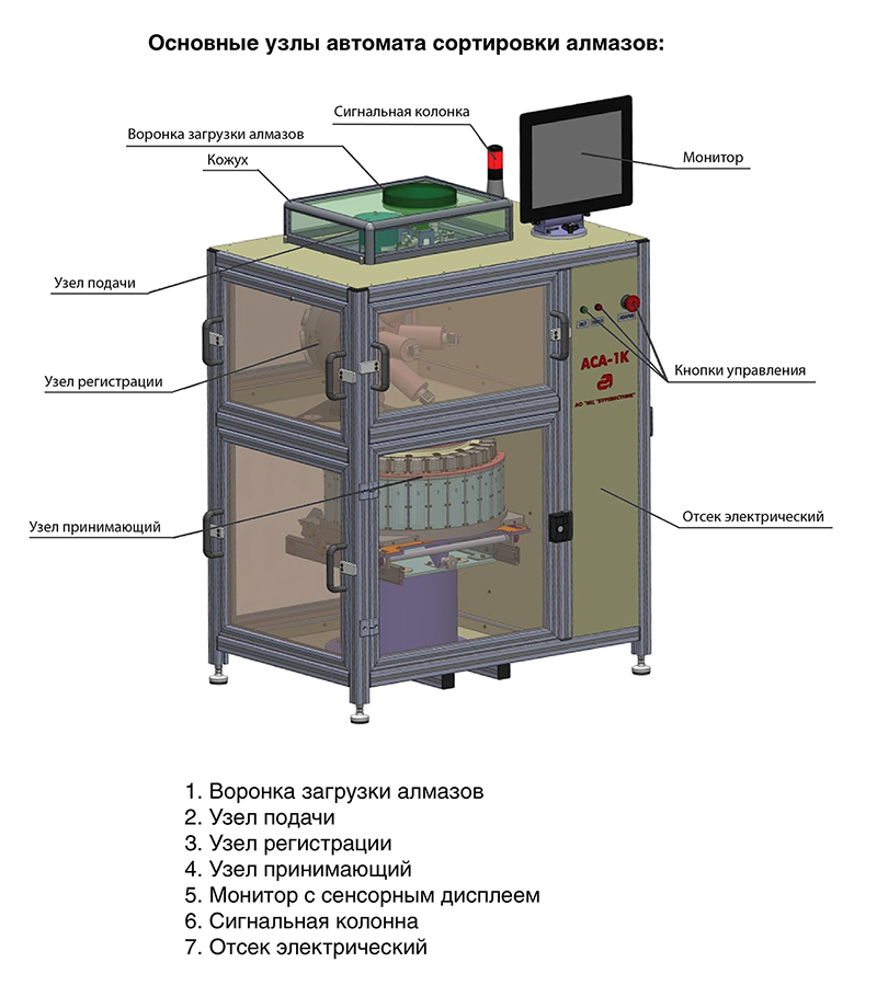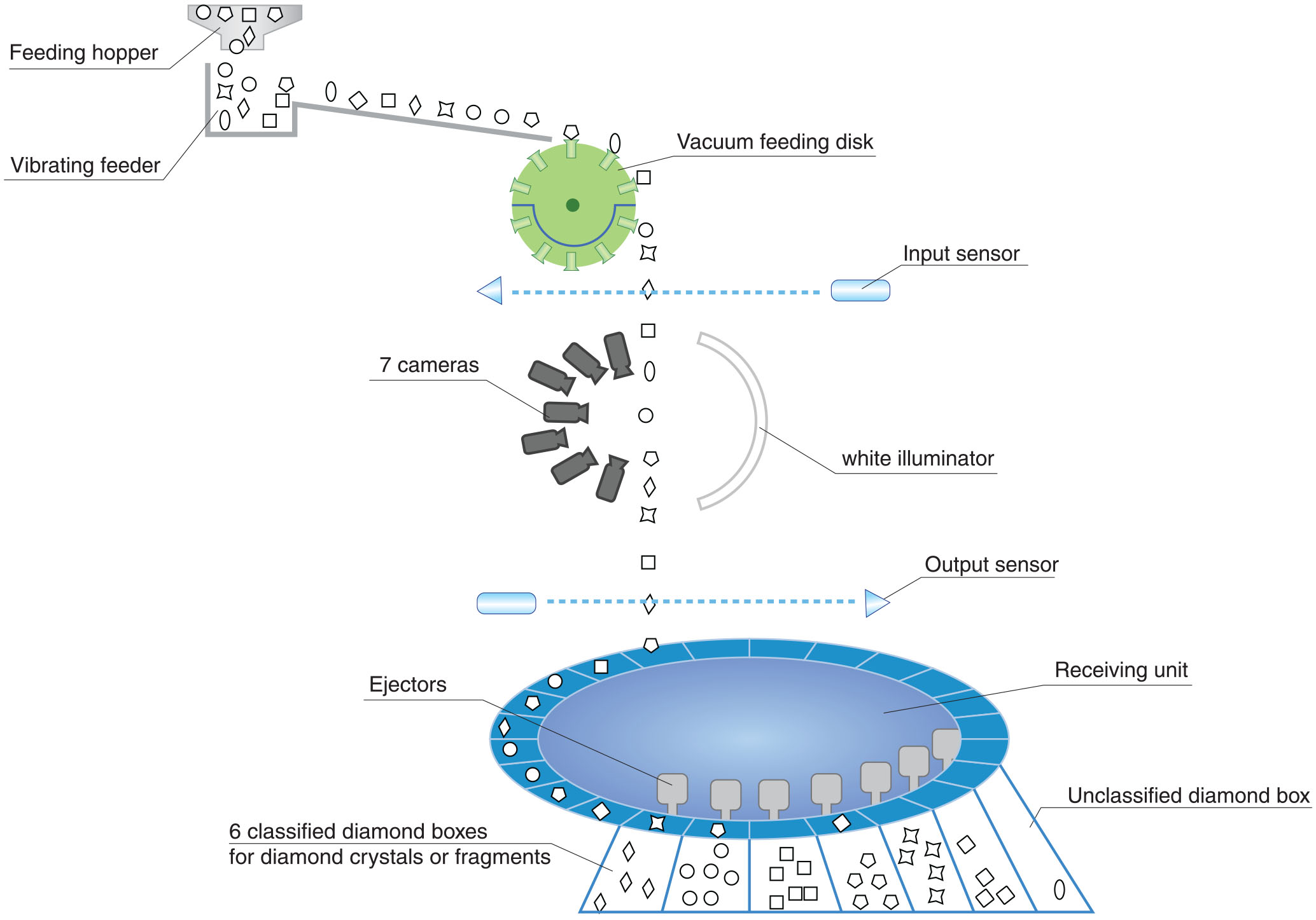 Principle of operation: Crystals or fragments of diamonds are fed one by one into the registration zone by means of a vacuum disk. Three video cameras transmit three projections of the diamond to the computer. The classifier program creates a qualitative model of the diamond and determines its quality. The diamond is placed in the cell of the receiving drum, from where it is cut off into the piggy bank at the command of the executive module.