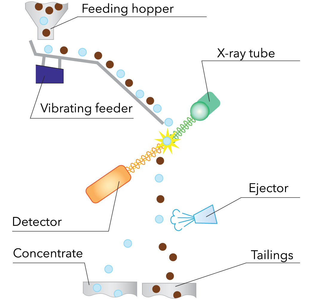 The technology of X-ray absorption systems is penetrating and allows to determine pieces with hidden ore minerals and inclusions. It does not require special preparation of the material for sorting (washing, surface cleaning), is widely used in the mining industry and is one of the most popular types of sorting systems today.