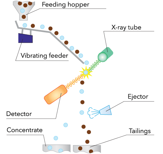 The principle of the sorter's operation is based on the property of materials to absorb X-rays. Diamond, consisting of the light element carbon with atomic number 6, absorbs X-rays less than the accompanying minerals containing heavier elements: silicon, calcium, magnesium, oxygen, iron and others.