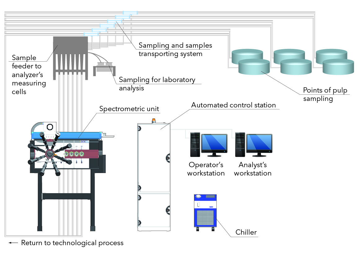 Automated system of analytical monitoring (ASAM) is a complex of technical means with centralized control designed for automatic selection of process products, transportation to the place of analysis, sample flow through the X-ray spectral analyzer and determination of the elemental composition of the sample. The analysis results are transmitted to the plant's process control system.