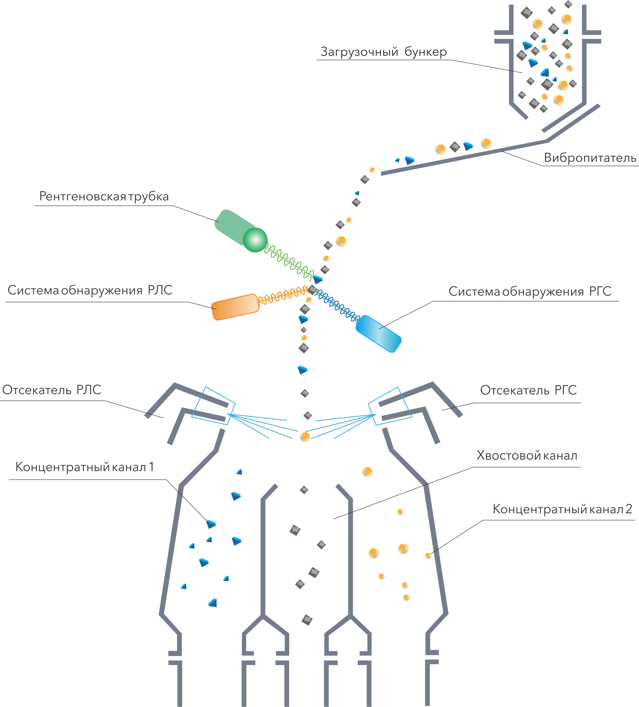 Система возбуждения, регистрации и отсечки позволяет осуществлять разделение исходной руды в обезвоженном и сухом виде. Сепаратор совмещает в себе два метода регистрации полезного продукта: рентгенолюминесцентный (РЛС) и рентгенографический (РГС).